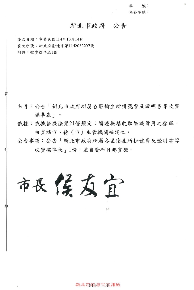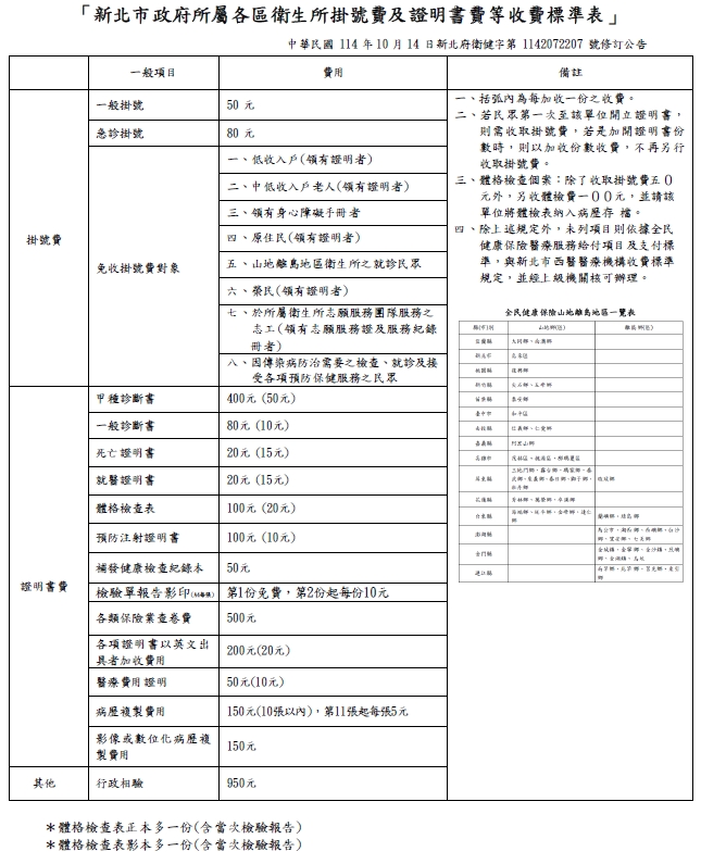 【林口區衛生所】更新「新北市政府所屬各區衛生所掛號費及證明書費等收費標準表」