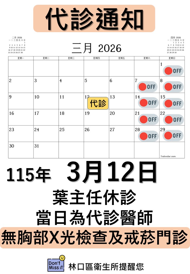 【林口區衛生所】115年3月家醫科代診及x光服務時間公告