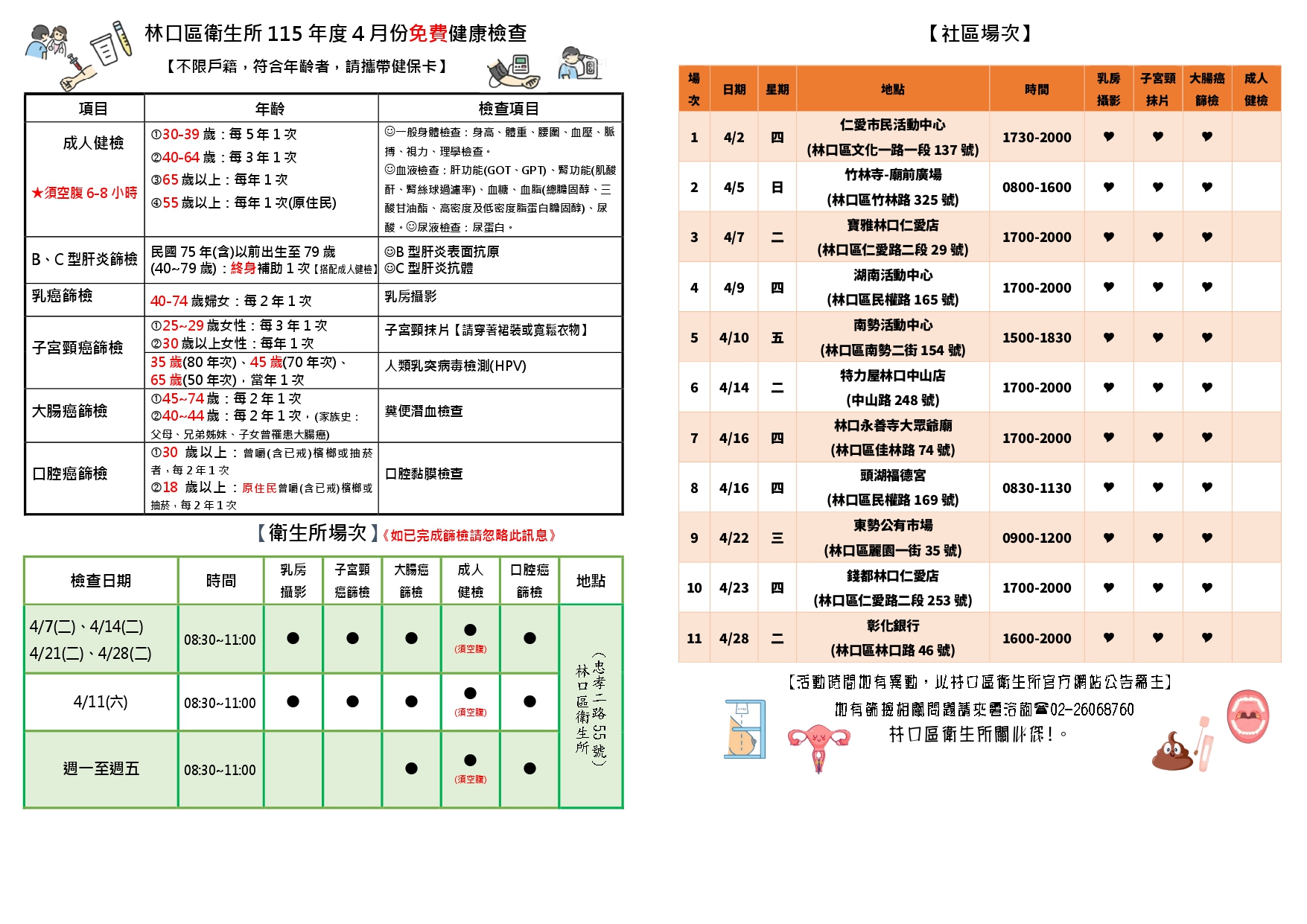 【林口區衛生所】115年4月衛生所及社區癌症篩檢活動場次