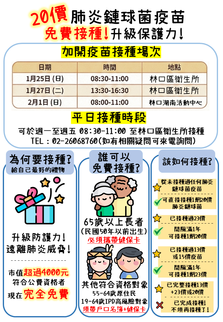 二、 65歲以上長者公費20價肺炎鏈球菌疫苗(PCV20)仍正常供貨,符合接種條件者,請至家庭醫學科門診就診。