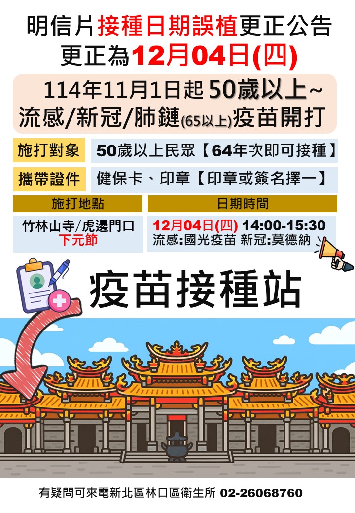 【疫苗設站更正公告】114年12月4日(四)竹林山寺設站更正公告