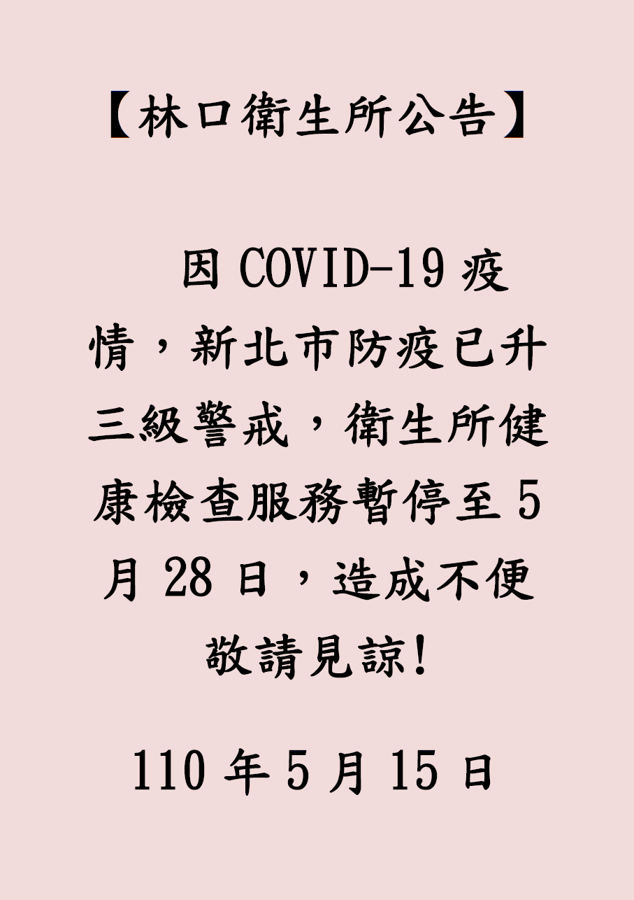 【林口區衛生所】新北市第三級防疫警戒5/15-5/28,健康檢查服務停至5/28,依疫情公告修正相關辦理活動。