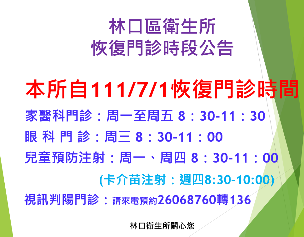 【林口區衛生所】111年7月1日起恢復門診時間公告