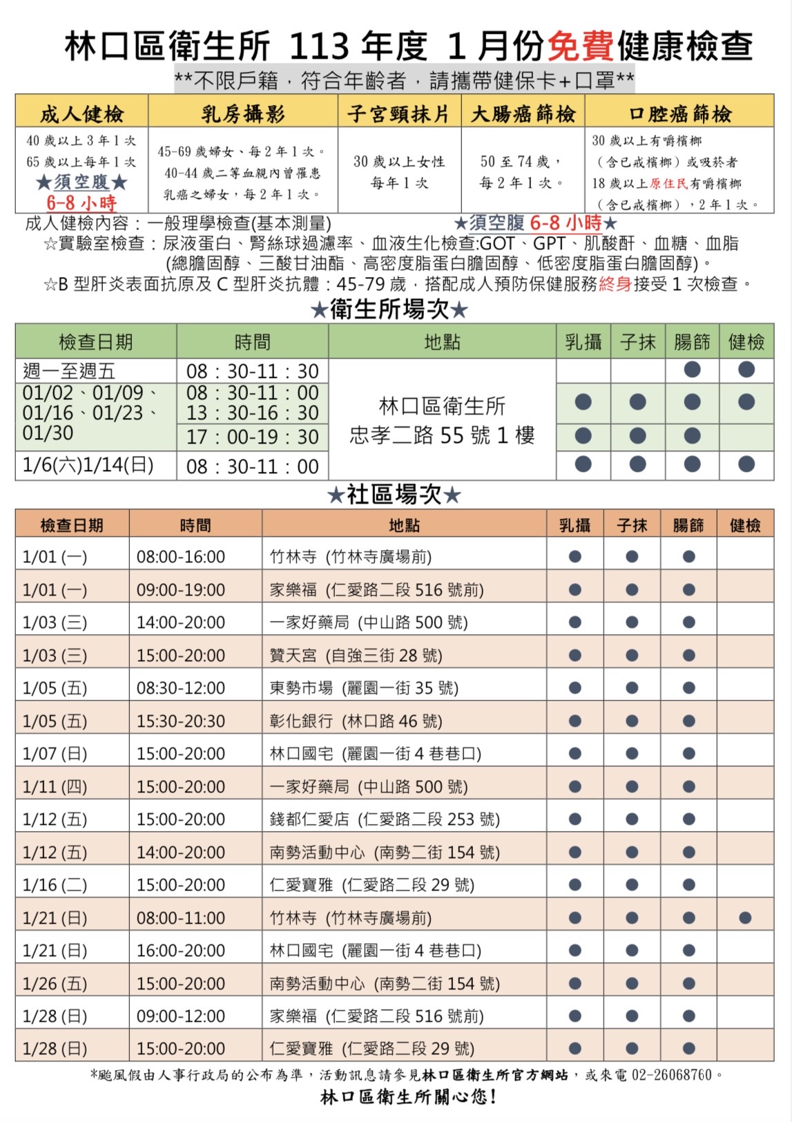 【林口區衛生所】113年1月免費健康檢查