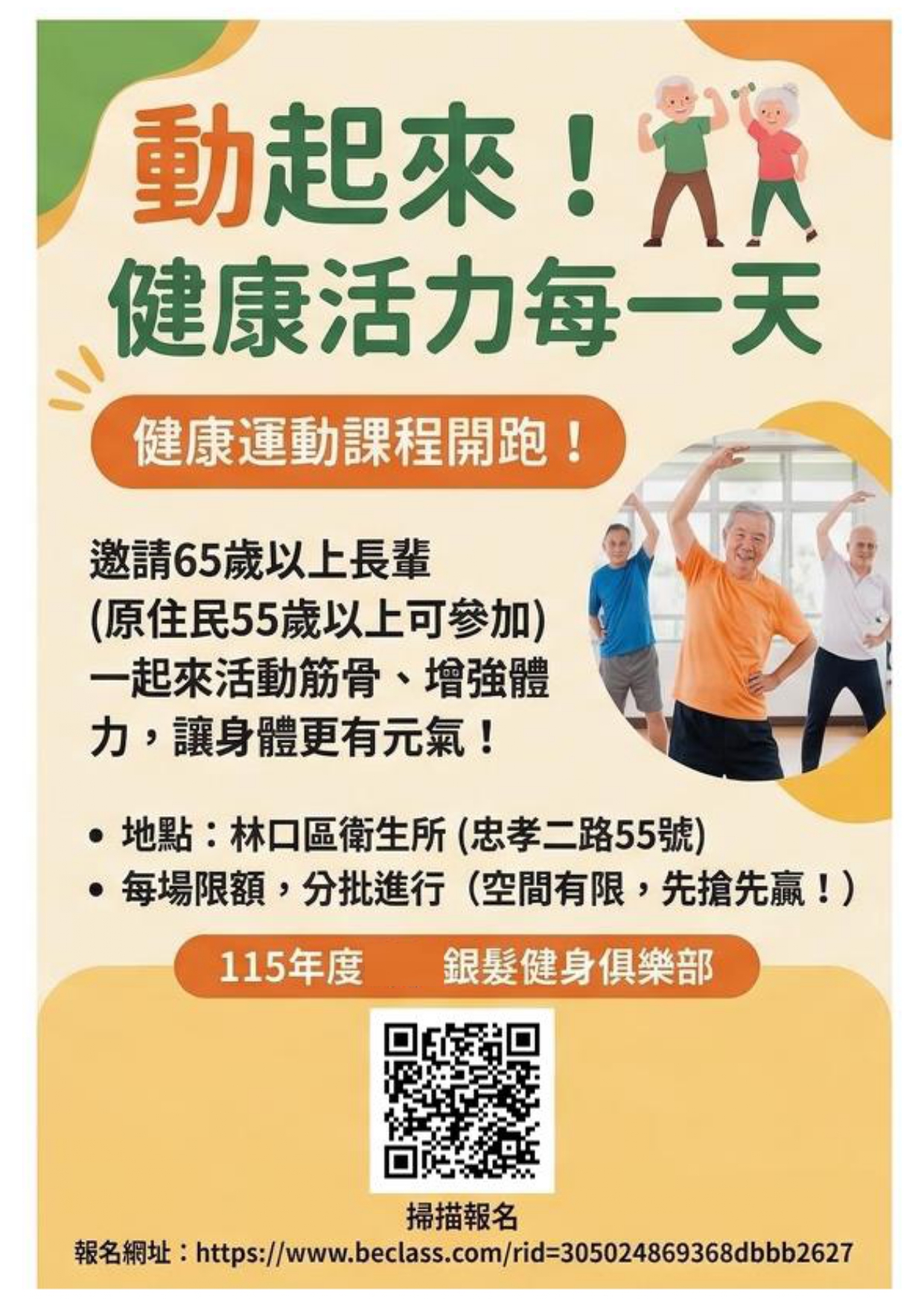 115年度-銀髮健身俱樂部報名網址 : https://www.beclass.com/rid=305024869368dbbb2627