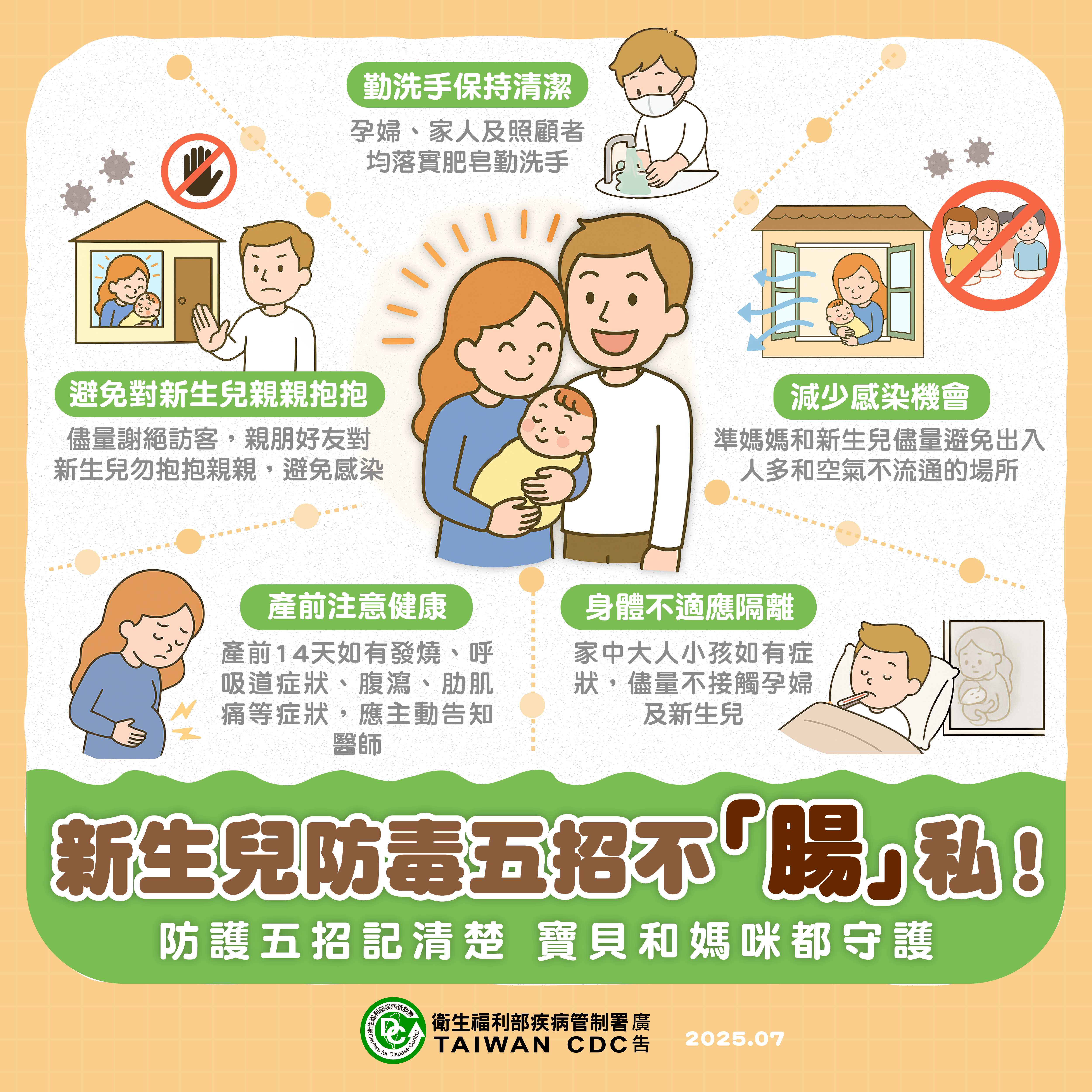 疾管署呼籲,新生兒感染腸病毒可能會出現發燒或低體溫、活力不佳、喝奶量變少等情形,且病程發展快速,未及時治療可能發展為心肌炎、肝炎、腦炎、多發性器官衰竭等重症,嚴重可能威脅生命,因此一旦有上述症狀,務必儘速就醫。5歲以下嬰幼童為腸病毒重症高危險群,如經醫師診斷感染腸病毒,請留意嬰幼童健康狀況,如有嗜睡、意識不清、活力不佳、手腳無力或麻痺、肌躍型抽搐(無故驚嚇或突然間全身肌肉收縮)、持續嘔吐與呼吸急促或心跳加快等腸病毒重症前兆病徵,請儘速送到大醫院接受治療。有關腸病毒防治相關資訊可至疾管署全球資訊網(https://www.cdc.gov.tw)「腸病毒防疫專區」查閱,或撥打免付費防疫專線1922(或0800-001922)洽詢。